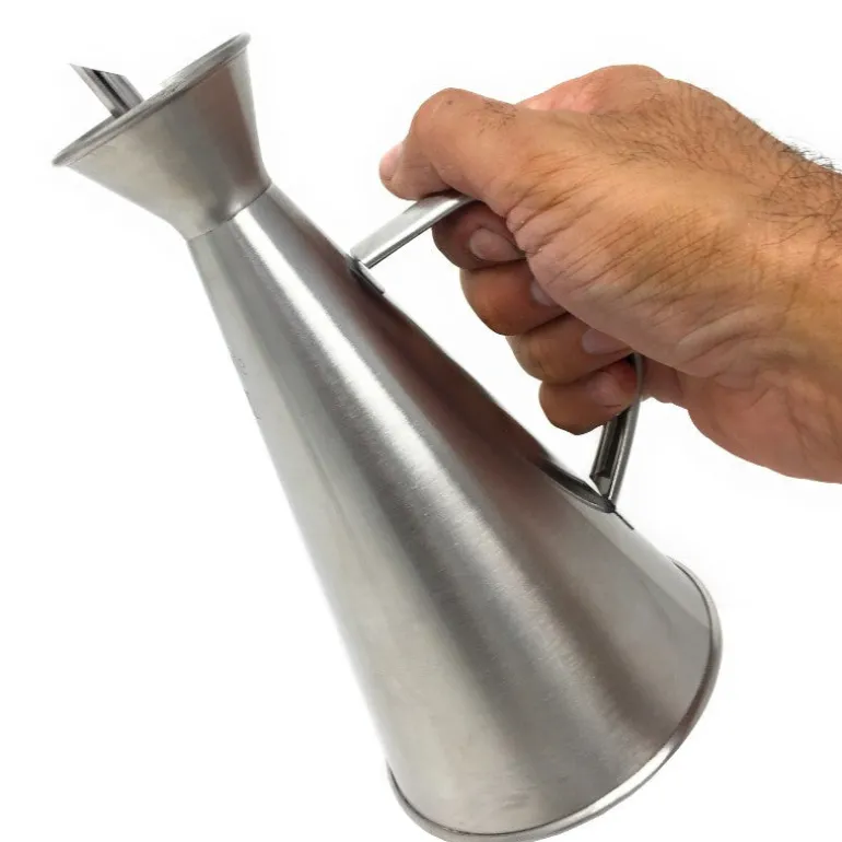 - Fabricada en acero inox , cónica y con una capacidad de 750 Cc. tiene una boca en forma de embudo que facilita su llenado.