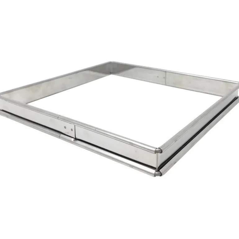 Estos aros cuadrados de acero inoxidable de 2 cms de altura se destinan particularmente a la confeccion de tartas. El aro para las tartas es mas facil de utilizar que un molde porque es menos voluminoso sobre un placa de pasteleria. Ademas es muy facil desmoldarlo.