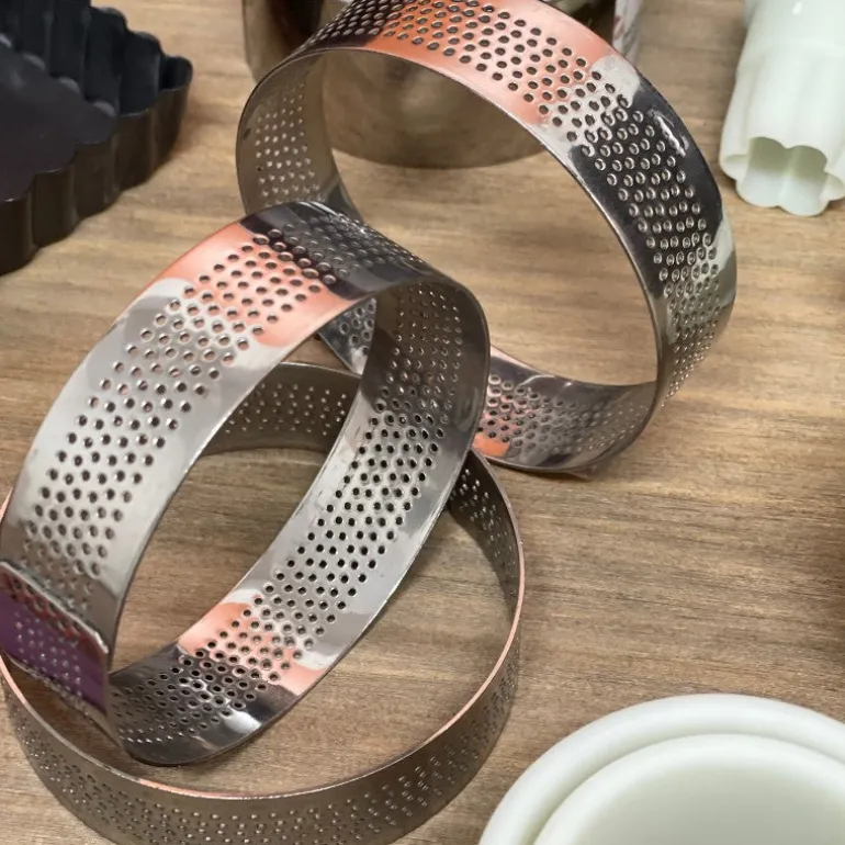 La principal ventaja de usar un aro redondo perforado para tartaletas es que se cocina de manera más uniforme y se evita que se hinche en el centro. Los agujeros permiten que el calor penetre en el pastel desde el fondo y los lados, lo que da como resultado una cocción uniforme en todas partes.