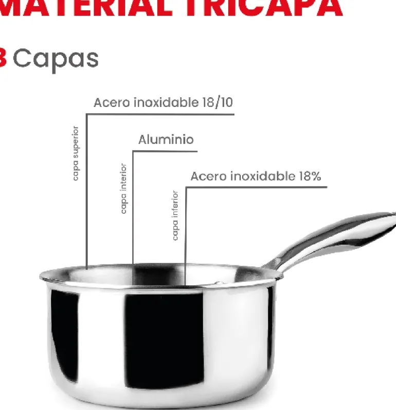 Este cazo tricapa de acero inoxidable es resistente y duradero, ya que cuenta con una capa de aluminio en el centro que permite una distribución de calor uniforme. Perfecto para cocinar de manera eficiente y obtener resultados de alta calidad. Una excelente adición a su colección de utensilios de cocina.