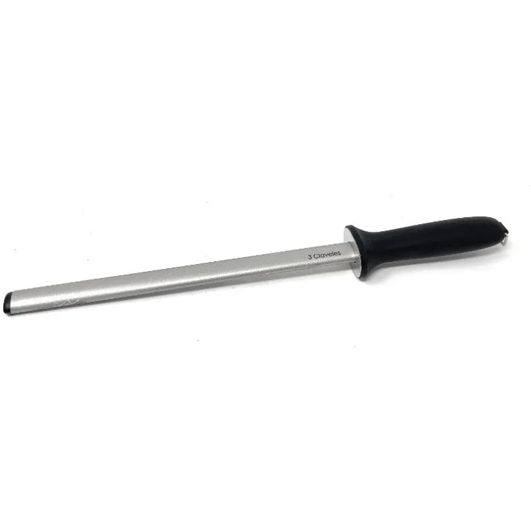 Manteniendo un ángulo constante de aproximadamente 20º, deslice el cuchillo describiendo un arco, desde el mango hasta la punta, a lo largo de toda la chaira.Al efectuar estos movimientos, evite golpear el cuchillo contra el protector del mango o contra la propia chaira, pues ello podría dañar el filo.Cada lado del filo debe ser afilado alternadamente, en movimientos uniformes que cubran el filo en toda su extensión.Lave el cuchillo después de utilizar la chaira.