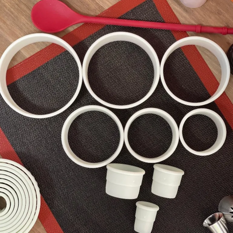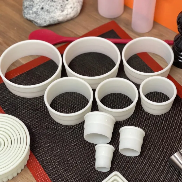 Es un juego de 9 unidades de cortadores que vienen en forma redonda lisa, es decir no tiene ningún relieve en el borde. Sirven para cortar las masas para galletas dulces y saladas, el fondant para el decorado de las tartas e incluso puedes cortar tartas.