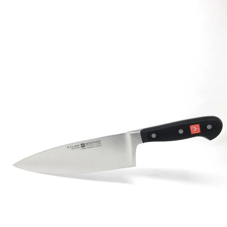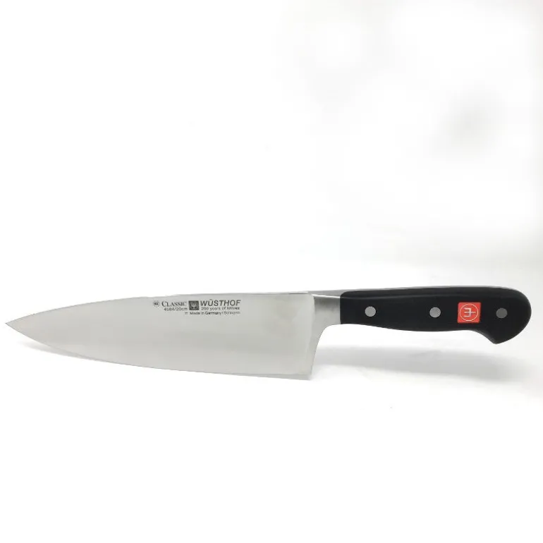 El cuchillo Chef Wüsthof Classic cuenta con una hoja de corte de 20 cm de largo, misma que mantiene un formato ancho estructurado sobre el mango de modo que mantiene a los dedos lejos de la línea del filo y contacto con los alimentos, permitiéndonos acentuar la presión en la línea de corte para un rebanado fluido y sin esfuerzo.