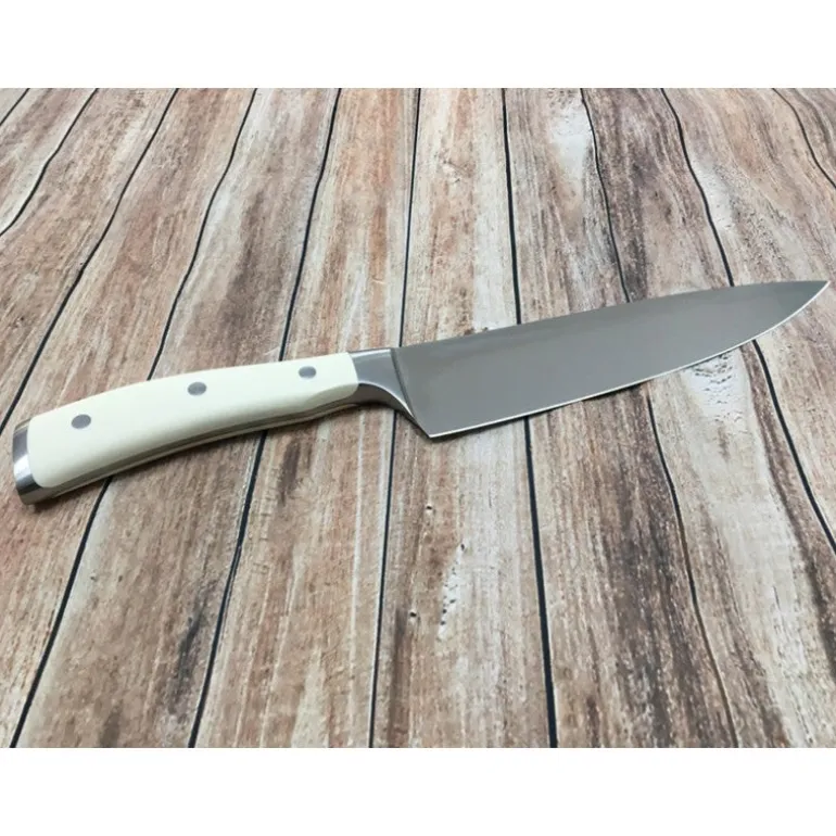 Cuenta con un mango unido a la hoja mediante triple remachado, y se encuentra fabricado en plástico especial, agradable al tacto y diseño ergonómico para un excelente control del cuchillo. No pasa desapercibido el color crema del mango, detalle que le da un atractivo formidable a este cuchillo de Wüsthof, dejándolo con una estética elegante pocas otras series de cuchillería de alta gamma tienen.