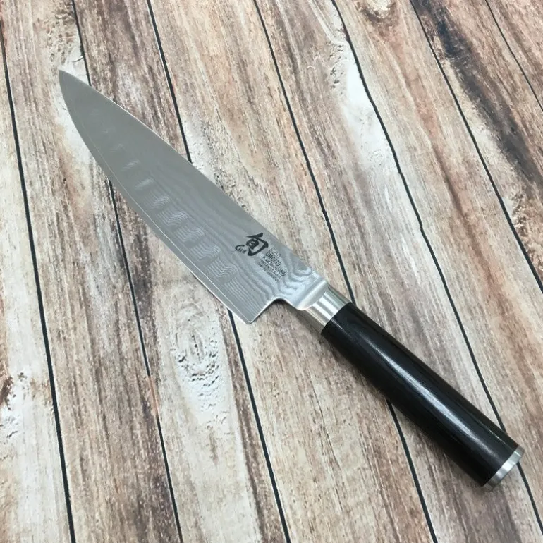 El cuchillo del chef Shun Alveolado están fabricado en acero de damasco la forma de la hoja es estrecha y posee unos huecos tanbien llamados alveolos que evitan que los alimentos se queden pegados en el cuchillo y además facilita el corte.