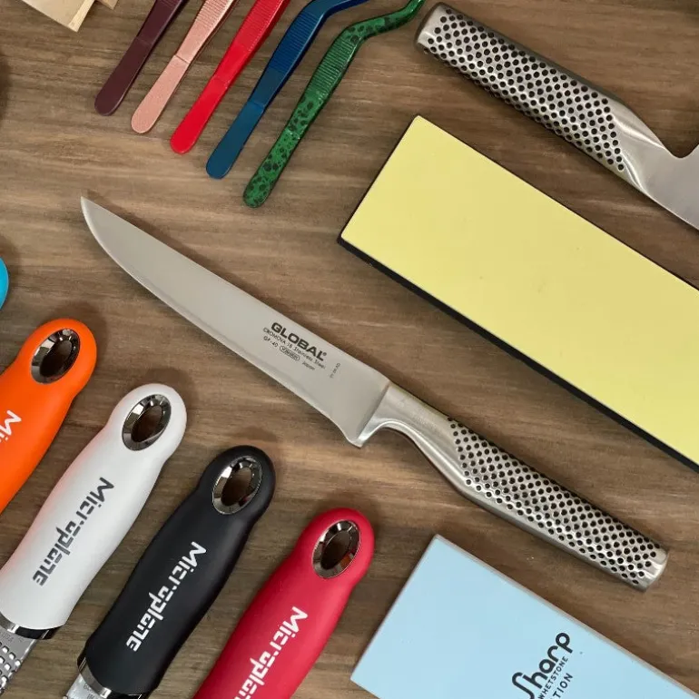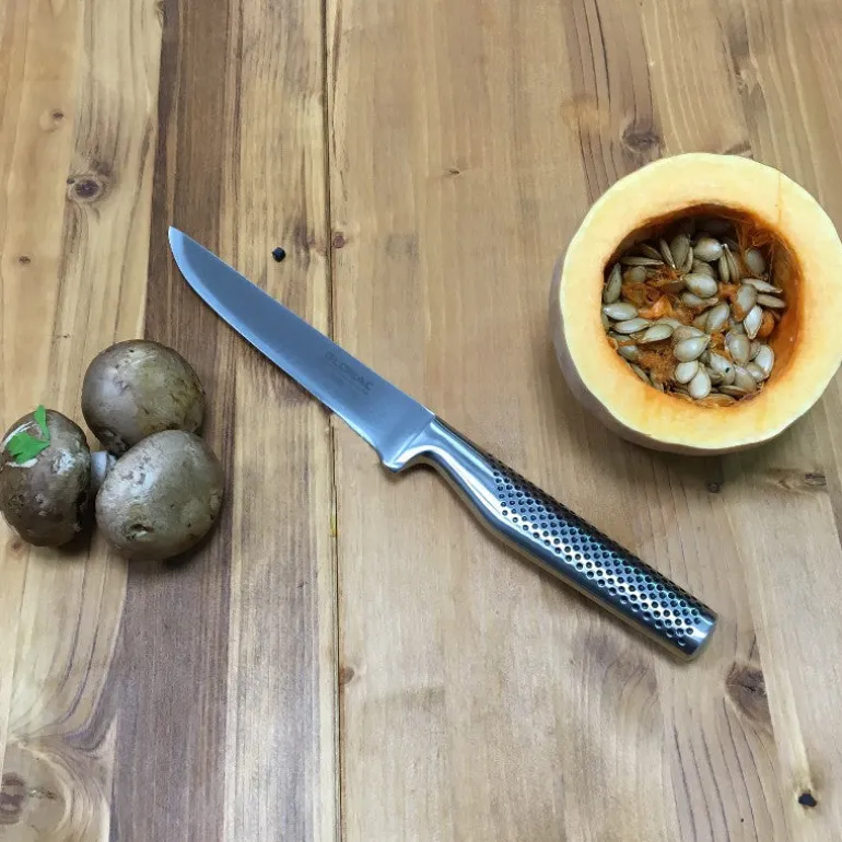 El Cuchillo deshuesador Global GF-40 Es más pesado que los de la gama G porque está destinado para un uso profesional. Corta la carne alrededor de los huesos y retira la piel de carnes y aves. Permite quitar fácilmente tendones y grasa. Sus hojas forjadas, se templan y se afilan en ambos lados de la hoja con el exclusivo acabado de filo cóncavo Global.