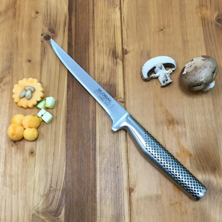 La hoja del cuchillo Global GF-31 mantiene 16 cm de largo (30 cm de longitud total), misma que cuenta con un modelado estrecho que se subsana en resistencia gracias a la dureza del acero, todo lo cual permite tener en la hoja el tamaño y flexibilidad ideal para realizar un deshuesado sencillo.