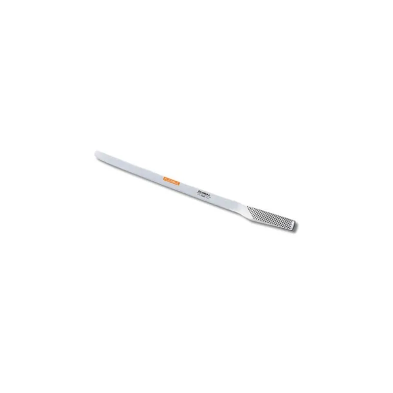 El cuchillo jamonero Global de 30 centímetros tiene una hoja muy flexible, que facilita el corte del jamón y otros alimentos. Gracias a que este utensilio este compuesto de cromo lo hace resistente a la corrosión ambiente y al desgaste. Es sencillamente un cuchillo sobresaliente y fabricado directamente desde Japón. Posee un filo óptimo, es ligero y su uso es muy práctico.