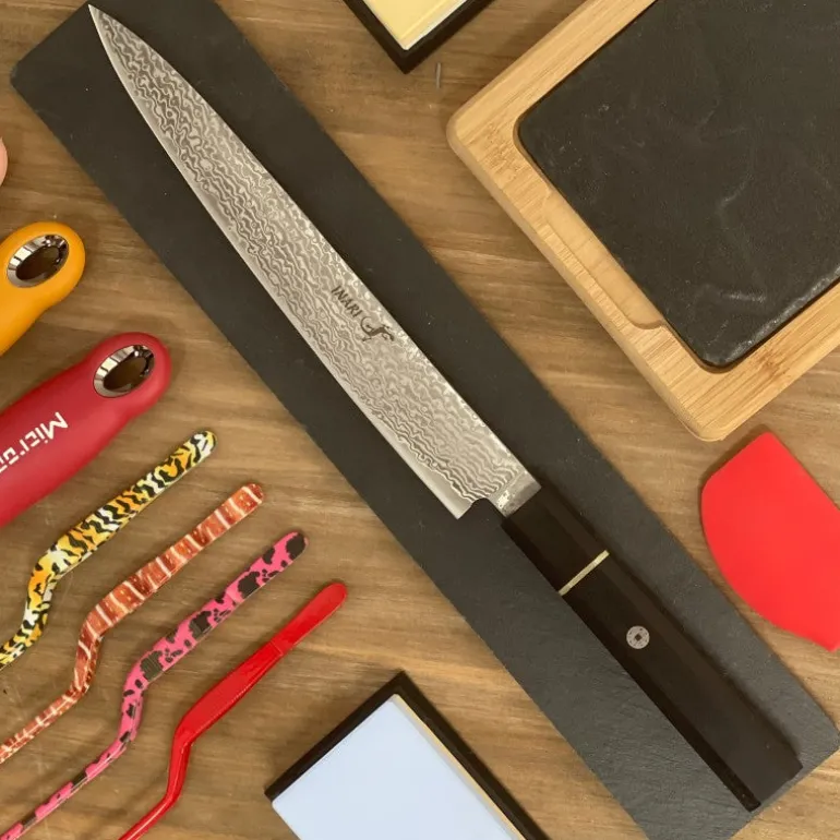 Cuchillo para Sushy tipo Sujihiky con 18 Cms de hoja fabricado en acero Damasco VG10 con 67 capas, mango de madera de ébano con mosaico.