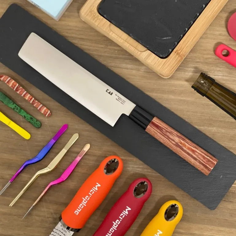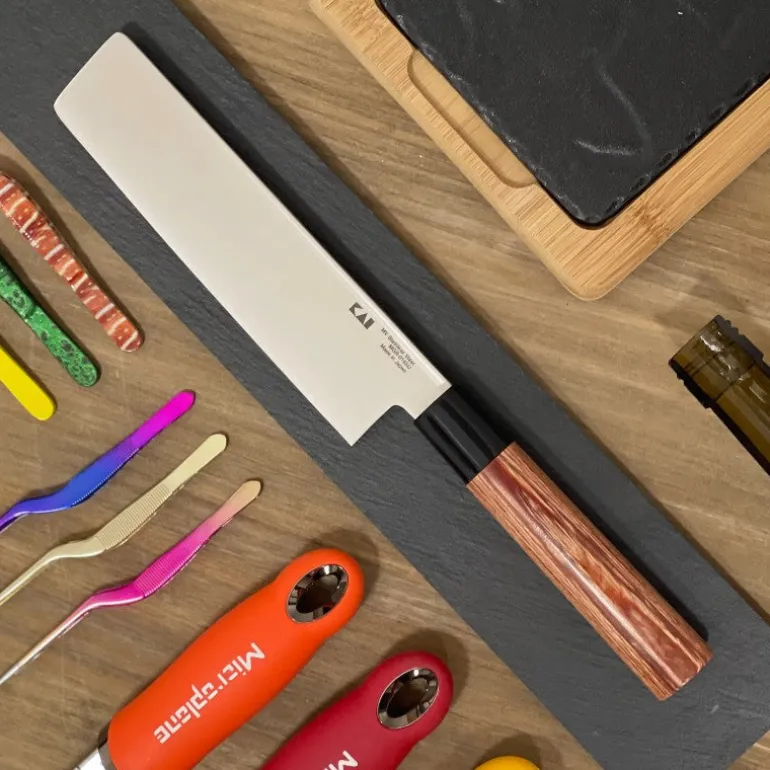 El Usuba Kai es un cuchillo tradicional japonés con una hoja similar a la de una cuchilla. La hoja es ancha y de forma rectangular, por lo que es ideal para cortar verduras como zanahorias y pepinos. También es ideal para cortar pescado. El mango de madera laminada de paka roja da nombre a este cuchillo y lo hace destacar entre otros cuchillos de la misma serie. El mango está hecho de pakka laminada y ha sido lacado para evitar daños por la humedad.