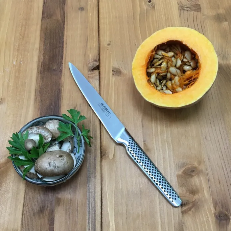 El cuchillo utilitario es el cincel por excelencia usado en cocina, pues además de permitirnos pelar la piel de vegetales y frutas, también resulta ideal para retirar tallos, seccionar imperfecciones en cortes de carne y si la calidad del cuchillo es la ideal, puede ser una excelente hoja de corte para deshuesar y, si de buena calidad hablamos, este cuchillo utilitario Global GSF-24 está a la altura de uso de un chef profesional.