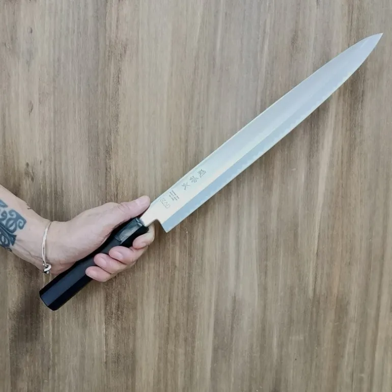 Los cuchillos Seki Magoroku KK Yanagiba son dos nuevos modelos de corte japonés, de forma pura y con un mango negro mate octogonal de madera de pakka. La forma del cuchillo, extremadamente largo y estrecho, permite hacer cortes muy finos y precisos – perfectos para cortar pescado. La hoja de un solo corte de los Yanagiba está hecha con acero inoxidable con alto contenido de carbono, que satisfará los estándares más exigentes. Además, está decorada con una ligera y elegante ola satinada. La nueva serie KK combina calidad y robusteza con una funcionalidad sencilla y cómoda.