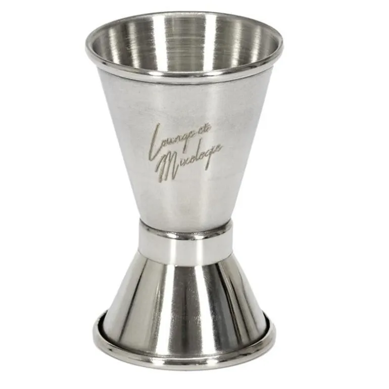 Los jigger o medidores suelen estar fabricados en metal. Tienen forma de reloj de arena, o lo que es lo mismo, dos conos pegados por la punta. Como su nombre indica, nos sirven para medir las dosis que vamos a echar en el coctel, y según el modelo el lado ancho puede ser de 5 ó 4 Cls, mientras que el lado pequeño es de 2 ó 2.5 Cls.