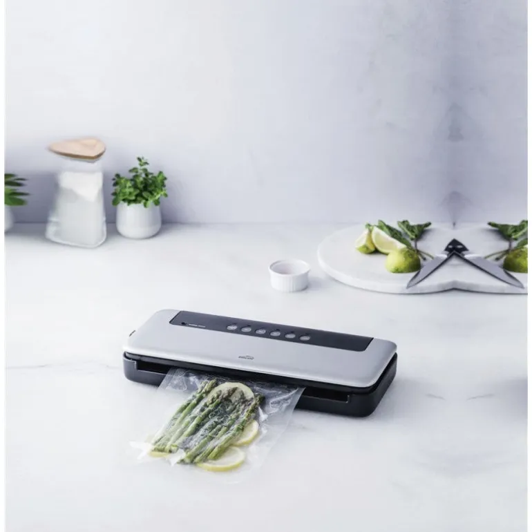 Esta máquina para envasar al vacío está diseñada para su uso en el hogar. Mantiene un diseño compacto, de fácil cabida en cualquier cocina, siendo sus dimensiones de 37.8 x 16.1 x 5.85 cm.