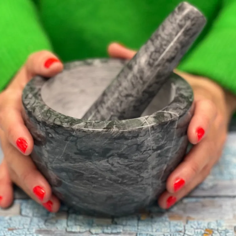 Este mortero de cocina cuenta con una construcción en mármol en color clásico grafito, mostrando un excelente pulido en la parte exterior, pero una textura sin pulir en el interior que facilita el machacado de los alimentos.