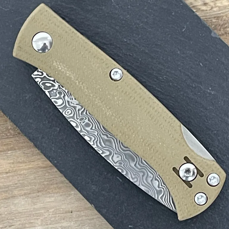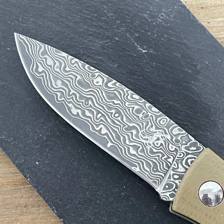 - 321525 Navaja Salamandra acero VG10 damasco , 67 capas, mango flax, atornillada, tamaño de hoja 75 mm, tamaño mango 95 mm, grosor hoja 3 mm, peso 70 grs, sistema de cierre de bloqueo.
