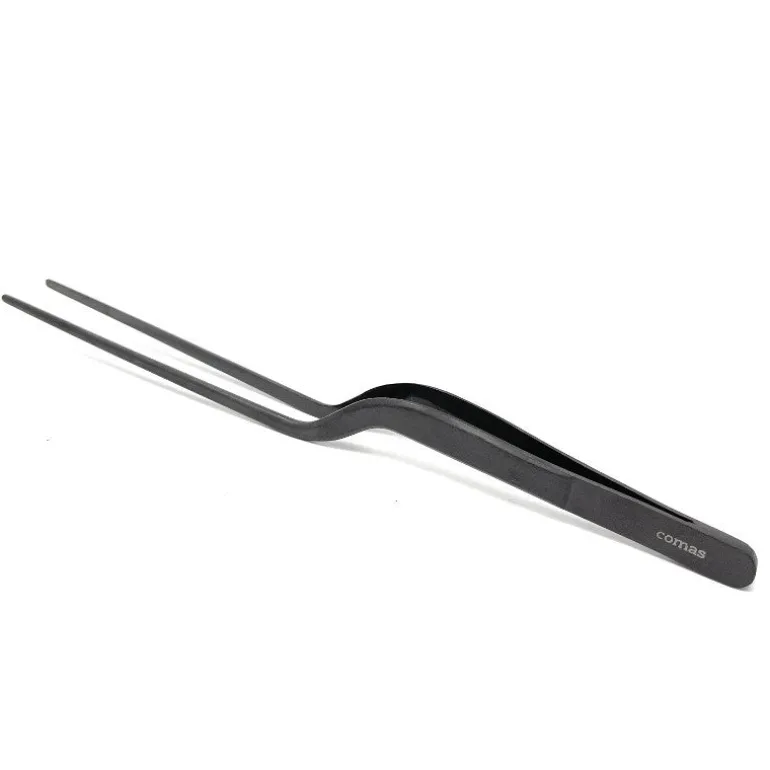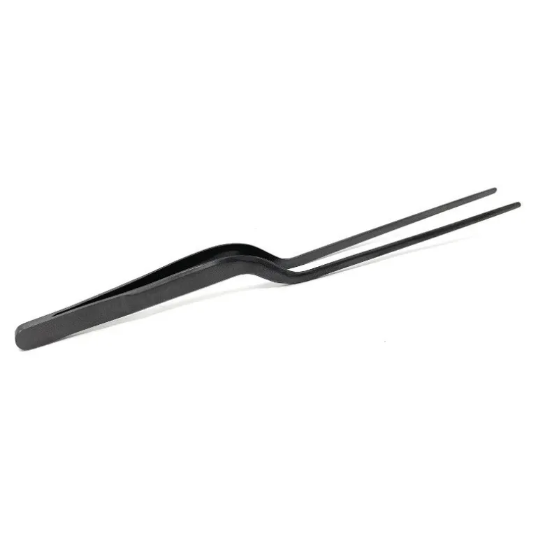 Mantiene un diseño de brazos largos, construcción en acero inoxidable con un acabado en titanium negro irisado que deja a la herramienta con un estilo refinado, ideal para el emplatado profesional y decoración de platos.