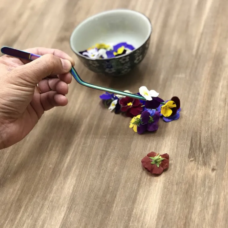 - Es una pinza pensada para manipular y emplatar alimentos cortados en trozos pequeños.