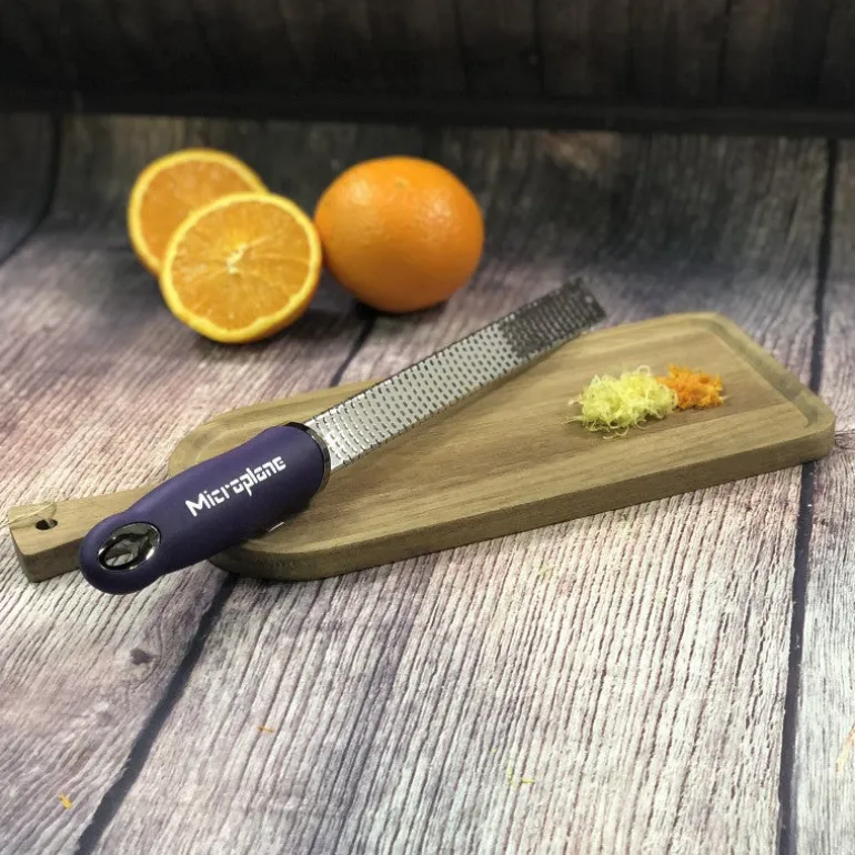 Los ralladores microplane son diferentes ya que sus cuchillas son ultra afilada y su filo a pesar de sus usos dura como el primer día gracias a su proceso químico, el rallador de color morado tiene un mango de silicona que es muy agradable al tacto y es ergonómico de color blanco. Con esta herramienta puedes rallar cualquier tipo de cítrico sin correr el riesgo de desprender la corteza amarga.