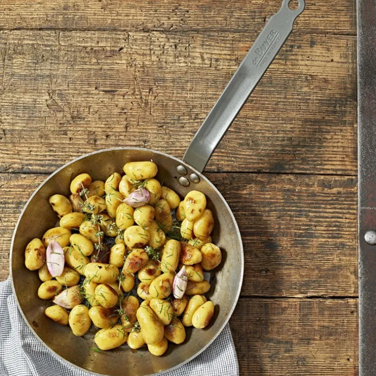 La sartén De Buyer está elaborada con acero al carbono de 2 mm de espesor y de alta calidad, por lo que tiene la capacidad de alcanzar temperaturas elevadas en poco tiempo, gracias a lo cual en ella se puede sellar, dorar y asar los alimentos con una textura y sabor inigualables y de manera eficiente. Por supuesto, el calor se distribuye de forma homogénea por toda la superficie, evitando puntos calientes que quemen los alimentos.