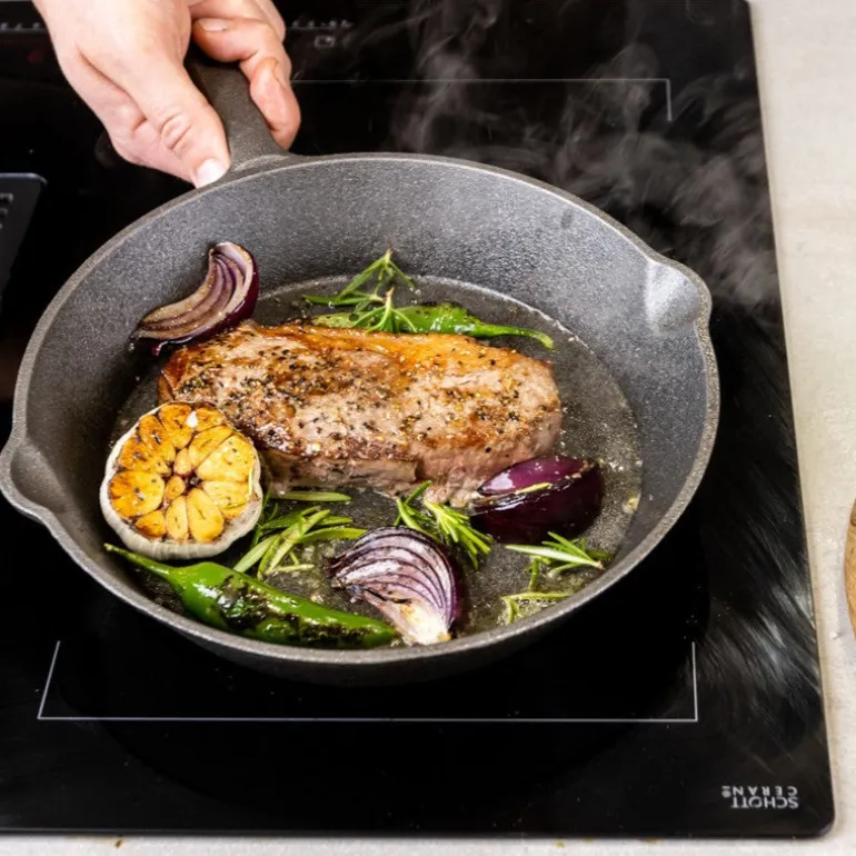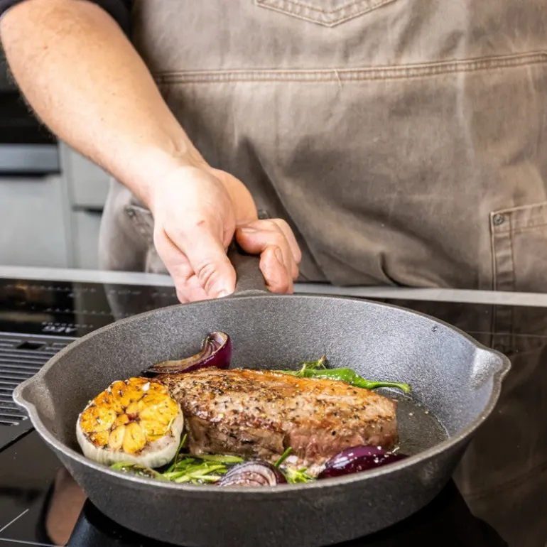 Esta resistente sartén de hierro fundido es imprescindible para cualquier amante de la comida, ya que le permite cocinar carne y verduras exactamente como le gustan, con la ventaja añadida de que no necesita aceite adicional. Dore, saltee, cocine a la parrilla y fría al contenido de su corazón con esta herramienta de cocina versátil que le permitirá preparar comida estilo restaurante desde la comodidad de su propia cocina. Está hecho de hierro fundido resistente, que se calienta en el horno para crear chisporroteantes platos a la parrilla. Lo mejor de todo es que ha sido ingeniosamente diseñado para cocinar sin necesidad de grandes cantidades de aceite. Nunca ha sido tan fácil cocinar comidas más saludables sin siquiera intentarlo. Asa los pimientos para una ensalada de rúcula veraniega. Prepara una guarnición rápida con rodajas de calabacín a la plancha con un aderezo picante. O haz carne al estilo barbacoa sin salir de tu cocina. ¡Ponte a la parrilla!