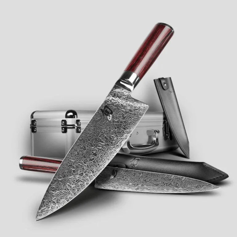 Con la combinación de cuchillo de chef y cuchillo multiusos, el juego soporta de manera ideal los diversos desafíos de corte en la cocina. El mango de madera de Pakkawood con vetas de color rojo intenso y negro en forma de castaño es extremadamente cómodo y seguro en la mano. Al mismo tiempo, la espiga continua garantiza el equilibrio óptimo entre hoja y mango. El tratamiento con resinas seleccionadas hace que los mangos de madera Pakka sean extremadamente resistentes a la humedad, flexibles, resistentes y duraderos. Los cuchillos siempre se guardan de forma segura en el estuche acolchado de aluminio con el logotipo de Shun. Además, las dos fundas de cuero incluidas en el juego ofrecen protección adicional para las hojas afiladas, incluso cuando los cuchillos se guardan y transportan fuera del maletín de aluminio.
