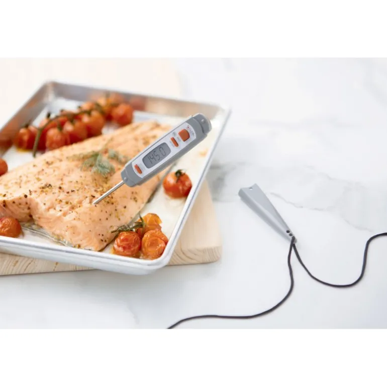 Especialmente en el ambiente de una cocina profesional o en el hogar el uso de un termómetro de cocina es una cuestión que va más allá de dejar un filete o plato con la temperatura ideal, sino de cocinar los alimentos a la temperatura idónea para un consumo seguro, algo que se descuida mucho en bastantes hogares. Pero medir la temperatura de los alimentos no es una tarea que requiera aparatos de alta tecnología, utensilios de cocina como este termómetro digital con pincho son económicos y muy sencillos de utilizar.