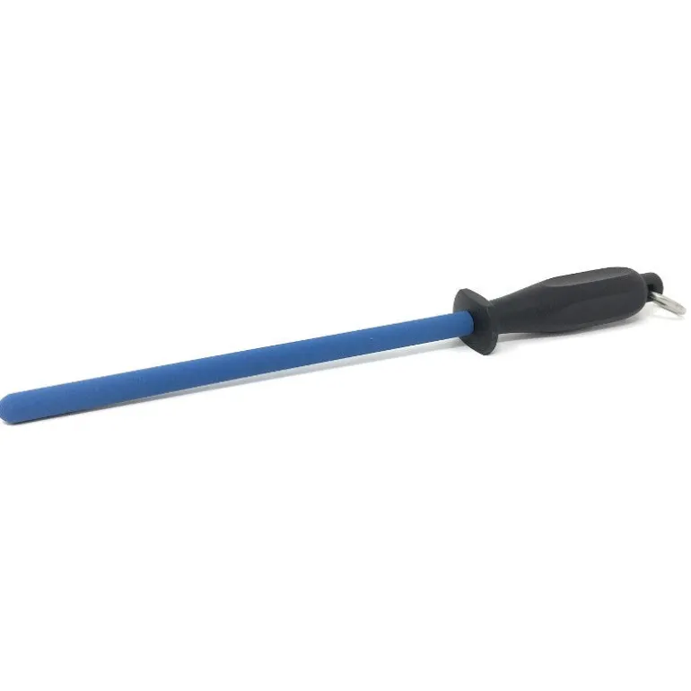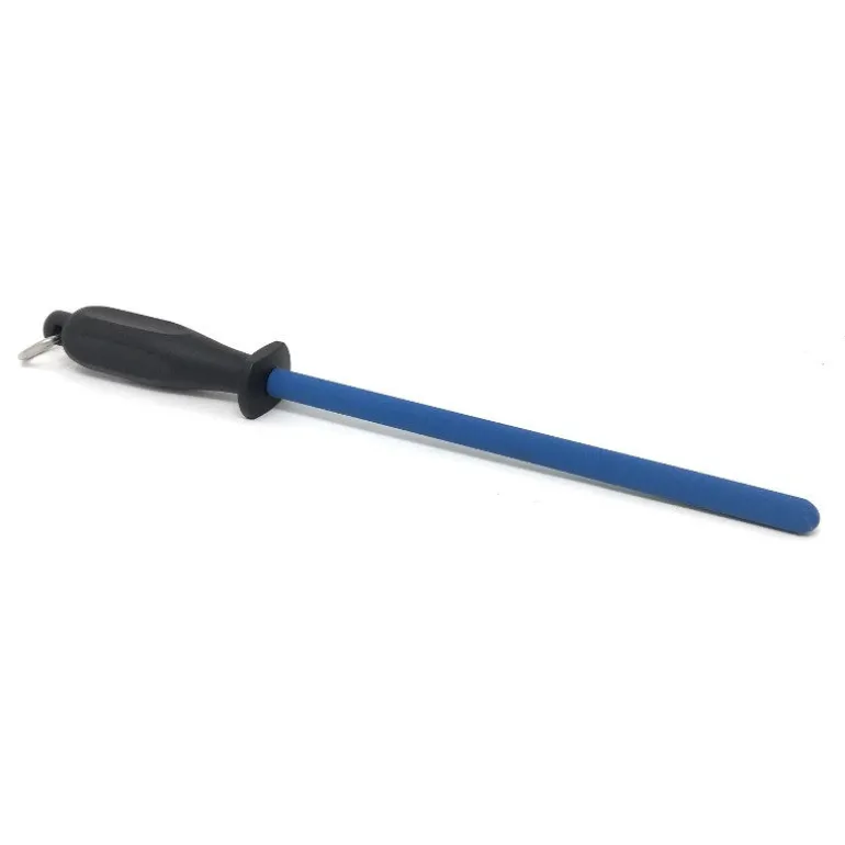 Este afilador de cuchillos mantiene un diseño tipo bastón, el cual permite un afilado rápido de la línea de corte de cualquier cuchillo. Cuenta con un mango ergonómico que permite un agarre fuerte a la hora de afilar, y que empuña una barra de cerámica azul, lo que distingue a este afilador de las típicas chairas de metal.