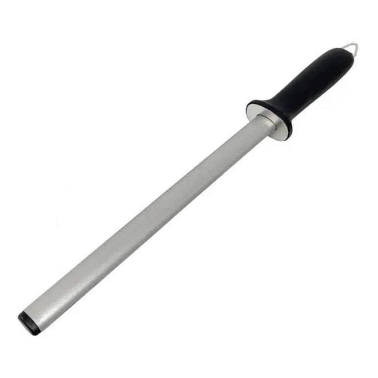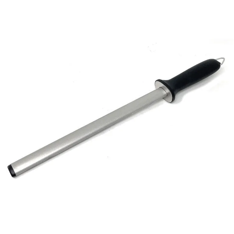 Manteniendo un ángulo constante de aproximadamente 20º, deslice el cuchillo describiendo un arco, desde el mango hasta la punta, a lo largo de toda la chaira.Al efectuar estos movimientos, evite golpear el cuchillo contra el protector del mango o contra la propia chaira, pues ello podría dañar el filo.Cada lado del filo debe ser afilado alternadamente, en movimientos uniformes que cubran el filo en toda su extensión.Lave el cuchillo después de utilizar la chaira.