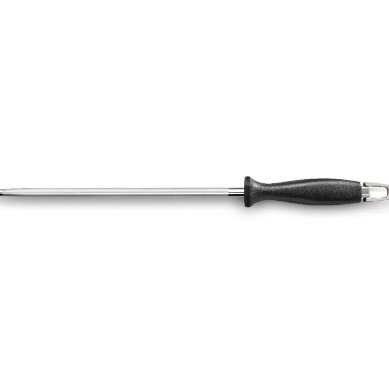 Manteniendo un ángulo constante de aproximadamente 20º, deslice el cuchillo describiendo un arco, desde el mango hasta la punta, a lo largo de toda la chaira.Al efectuar estos movimientos, evite golpear el cuchillo contra el protector del mango o contra la propia chaira, pues ello podría dañar el filo.Cada lado del filo debe ser afilado alternadamente, en movimientos uniformes que cubran el filo en toda su extensión.Lave el cuchillo después de utilizar la chaira.
