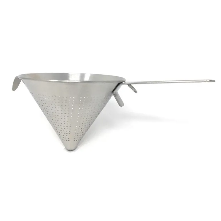 El colador chino de 20 Cms trae una pestaña y un mango rígido para que puedas apoyarlo sobre la olla. Este utensilio de cocina es un colador que posee una forma cónica. El mismo sirve principalmente para filtar o pasar salsas, caldos o cremas. Gracias a sus pequeñas perforaciones te permite colar fácilmente los líquidos y no deja pasar ningún tipo de grumos. Con el podrás lograr como un chef texturas muy suaves y delicadas sin necesidad de ser un profesional.
