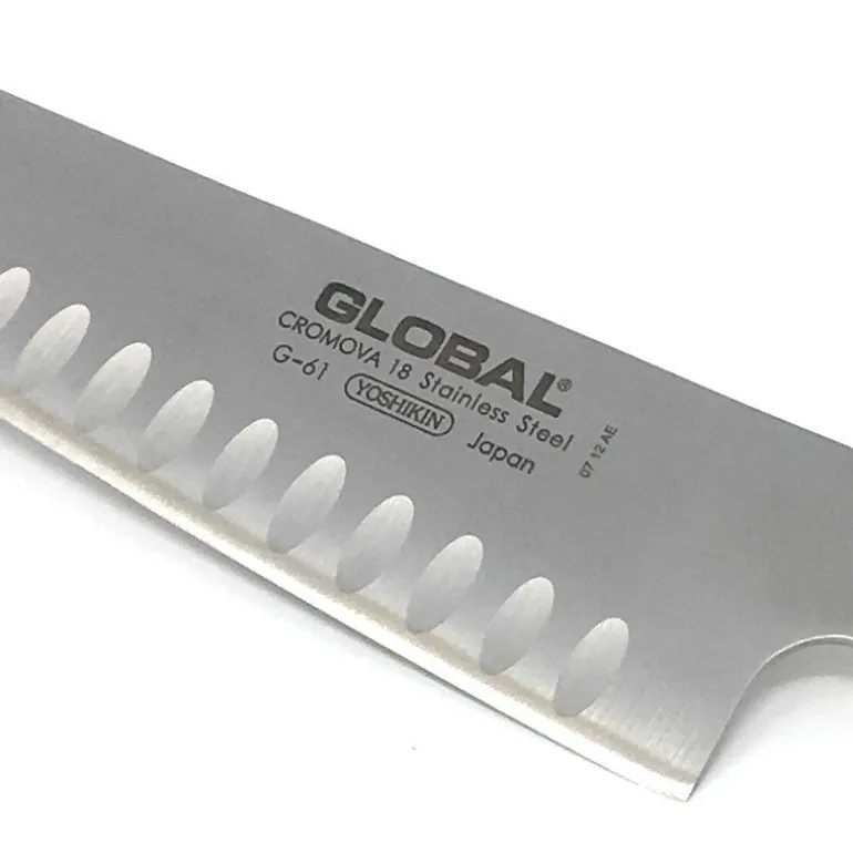 Los cuchillos Global de la serie de G se construyen de tres pedazos de acero inoxidable CROMOVA 18: la lámina y las dos mitades del mango. Las dos mitades del mango se sueldan juntas y se llenan con la cantidad adecuada de arena para crear el equilibrio perfecto. Los cuchillos Global de la serie de G son ligeros, no tienen un collar forjado y el mango se suelda en la lámina.
