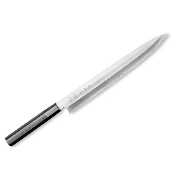 Los cuchillos de corte japonés Seki Magoroku KK Yanagiba se distinguen por su forma pura y el mango octogonal negro mate de madera de pakka. La forma extremadamente larga y delgada de la cuchilla permite cortes precisos y delgados como obleas, perfectos para cortar pescado. La hoja biselada de un lado del Yanagiba está hecha de acero inoxidable de alto carbono que cumple con los estrictos estándares europeos y está decorada con una línea suave y ondulada como un acabado satinado. La serie KK combina calidad robusta con funcionalidad simple.