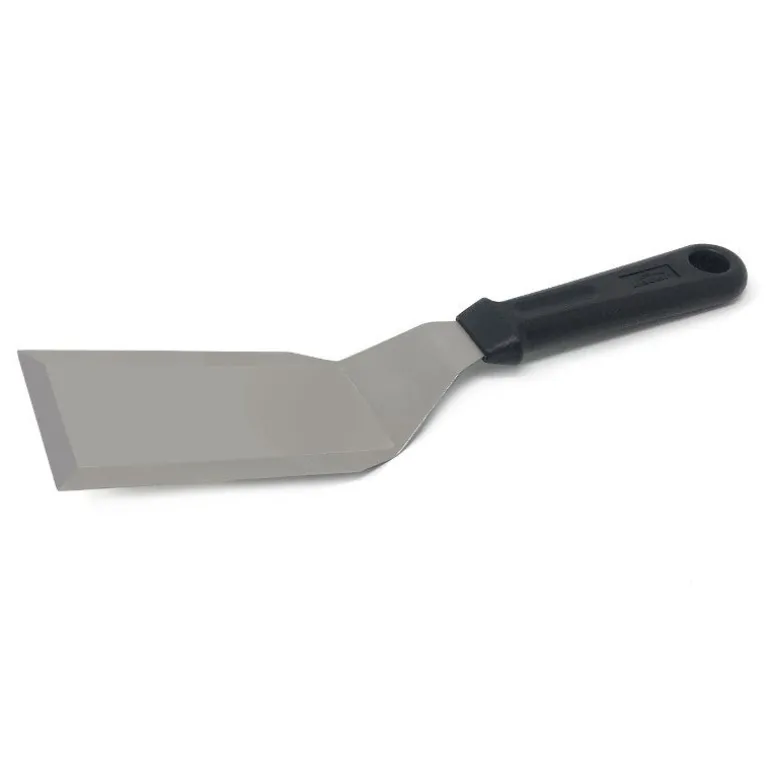 Su grosor más afilado hacia los bordes de la hoja es ideal no solo para pasar por debajo de los alimentos, sino también para el corte de algunos alimentos directamente en la plancha, así como para la limpieza de la misma, esto porque permite el raspado de residuos carbonizados de alimentos que quedan sobre la plancha después de haber cocinado.