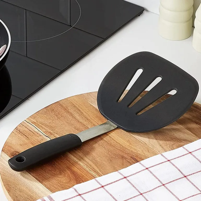 Ideal para sartenes antiadherentes. La resistencia, flexibilidad y forma de una hoja de espátula son tal vez las cualidades más importantes a la hora de adquirir este tipo de utensilio, más pocos fabricantes se enfocan en una forma innovadora que aporte un valor adicional a la hora de cocinar, tal como si lo hace esta pala flexible de silicona Oxo, cuya forma le hace ideal para la manipulación de cortes de carne y pescado.