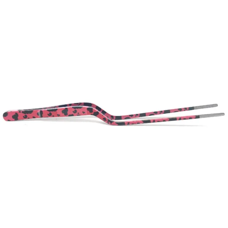 Esta pinza para emplatar cuenta con una estructura delgada, acodada en su estructura y con un largo de 20 cm que permite al profesional de catering la manipulación de pequeños trozos de alimento incluso si son frágiles o muy blandos, ya que su diseño nos permite aplicar la fuerza correcta para sostener el alimento en la punta de esta pinza sin aplastarlo, haciendo con ello una herramienta útil y la perfecta oportunidad para denotar la imagen de elegancia del servicio directamente al cliente.