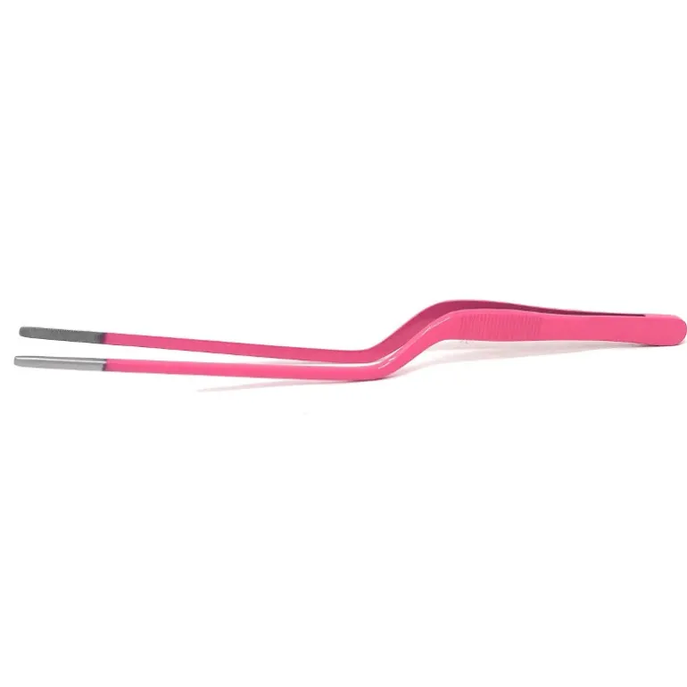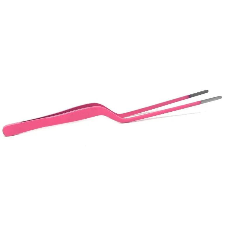 Construida en acero inoxidable, esta pinza para emplatar mantiene un color rosa y un diseño similar al de pinza quirúrgica que, al igual que las pinzas mencionadas, tienen también el objetivo de brindar delicadeza a la hora de manipular pequeños trozos de comida blandos y/o muy delicados.