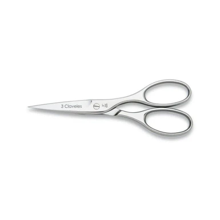 Estas tijeras de cocina 3 Claveles mantienen un formato similar a unas tijeras comunes, con un diseño cromado y mango ergonómico a los dedos, sin embargo, se distinguen al contar con un filo micro dentado que permite una total estabilidad al momento de realizar cortes de alimentos en la cocina, evitando que las cuchillas resbalen de los alimentos mientras se les corta.
